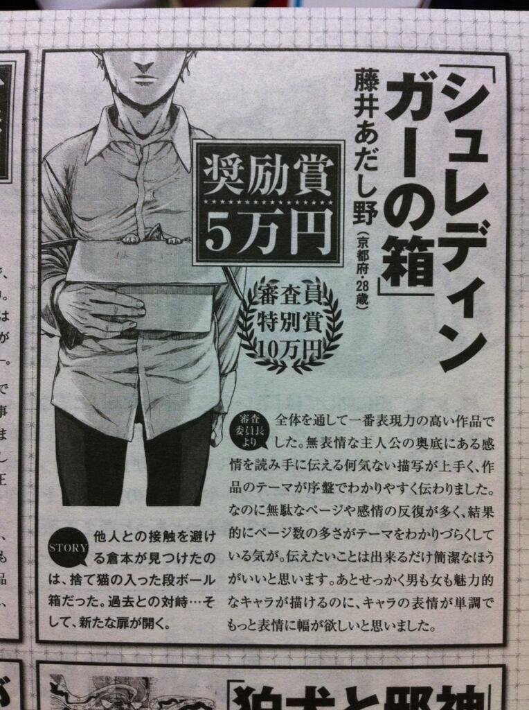 先日新潮社刊の漫画雑誌@バンチの第三回漫画大賞で奨励賞と副賞いただきました。