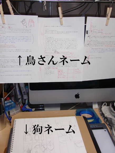 鳥さんから筋書きと台本のようなネームをもらう場合だと、こんな感じで左から右に出力した原稿を目の前にウンウン唸りつつ画面構成考えるのがセオリーです。